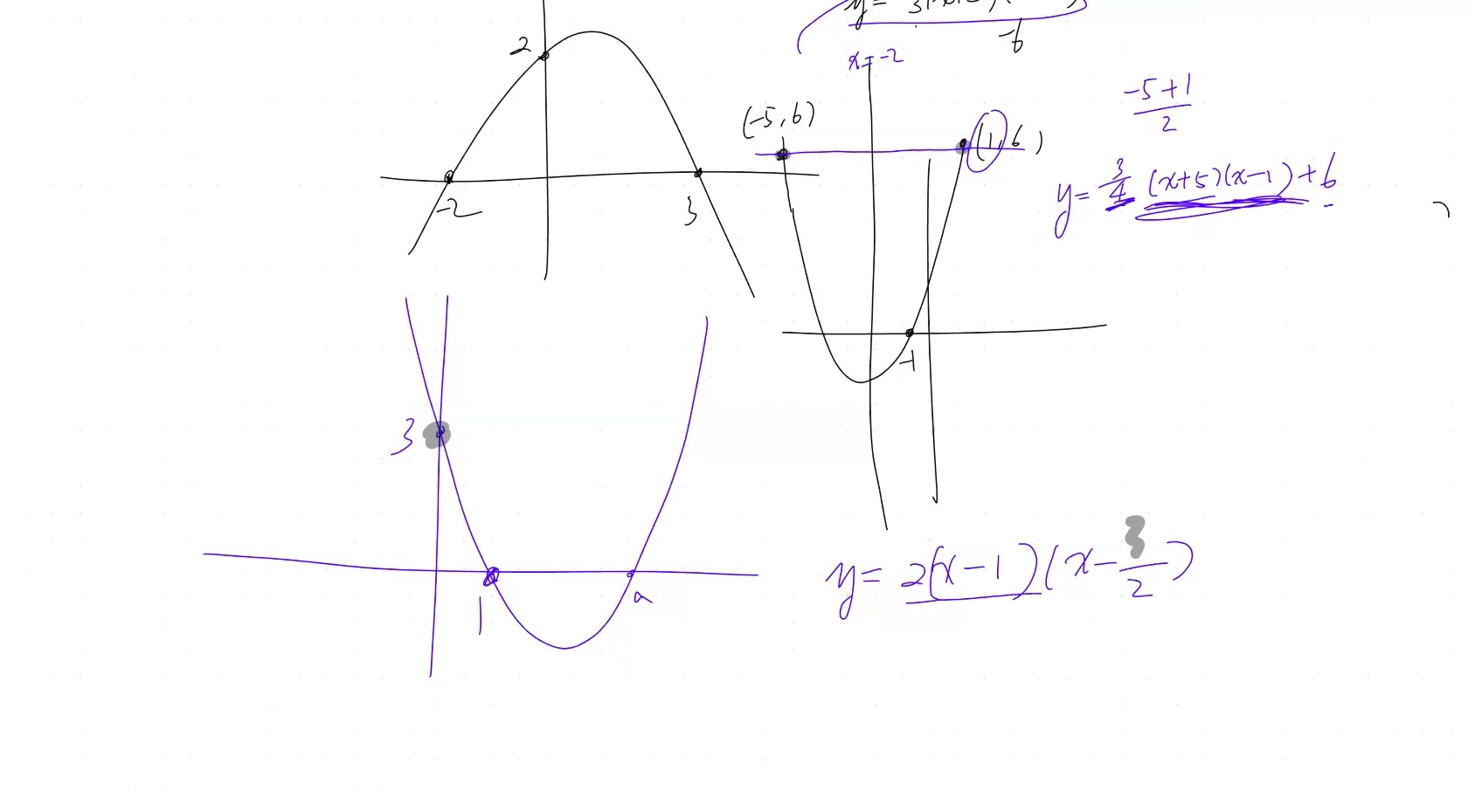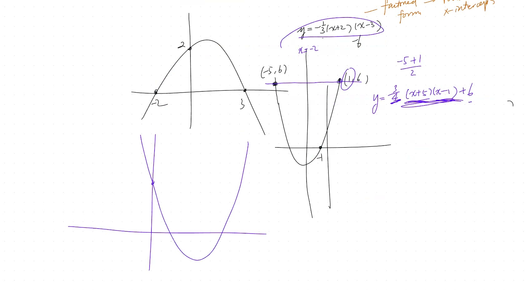 - Treat \(y = 6\) as a shifted x-axis: \(y = k(x - 1)(x + 5) + 6\)