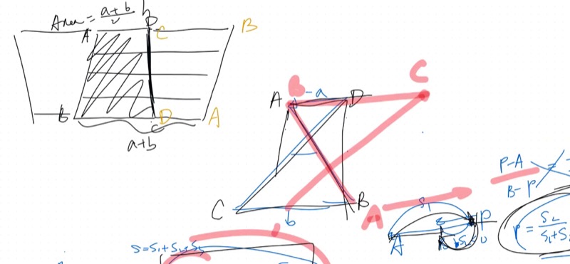 | Unsigned area | \(\frac{1}{2} \cdot \frac{a^2 + b^2}{a + b} \cdot h\) | \(A_1 + A_2\) (sum of triangles) |