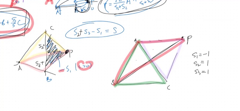 | Exterior barycentric coords | Same formula; \(S_i < 0\) when \(P\) is on far side of edge \(i\) |