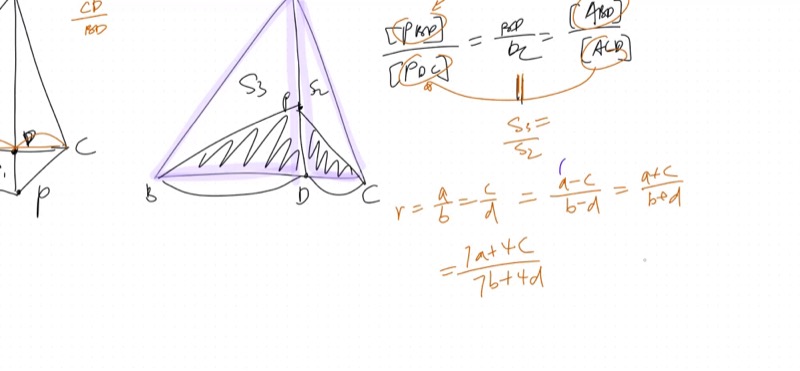 - This uses the butterfly triangle ratio: sub-triangles sharing a cevian maintain the same base ratio