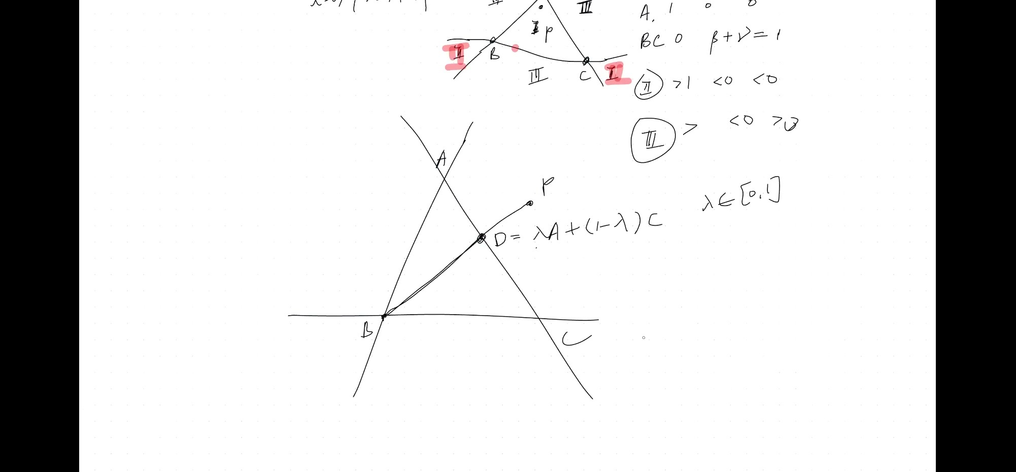 On a line between \(A\) and \(B\): \[P = \alpha \cdot A + \beta \cdot B \quad\text{where}\quad \alpha + \beta = 1\]