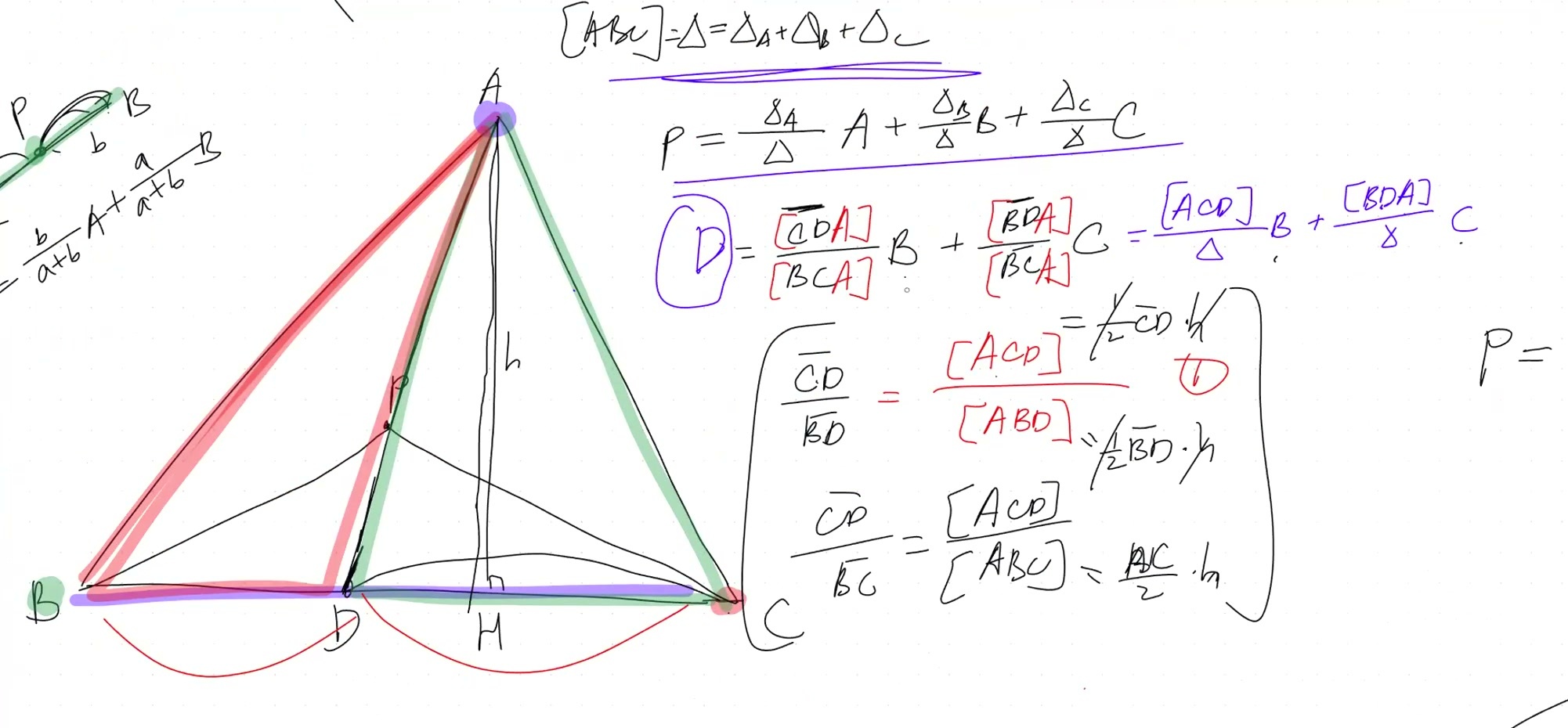 \[P = \frac{\Delta_A}{\Delta} \cdot A + \frac{\Delta_B}{\Delta} \cdot B + \frac{\Delta_C}{\Delta} \cdot C\]